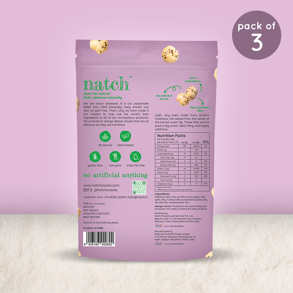 Delicately crafted from ancient makhana seeds, harvested from the sacred water lily, these airy pops are gently roasted in olive oil and blended with a zesty kick of wasabi. A unique and flavorful way to enjoy an age-old favourite.