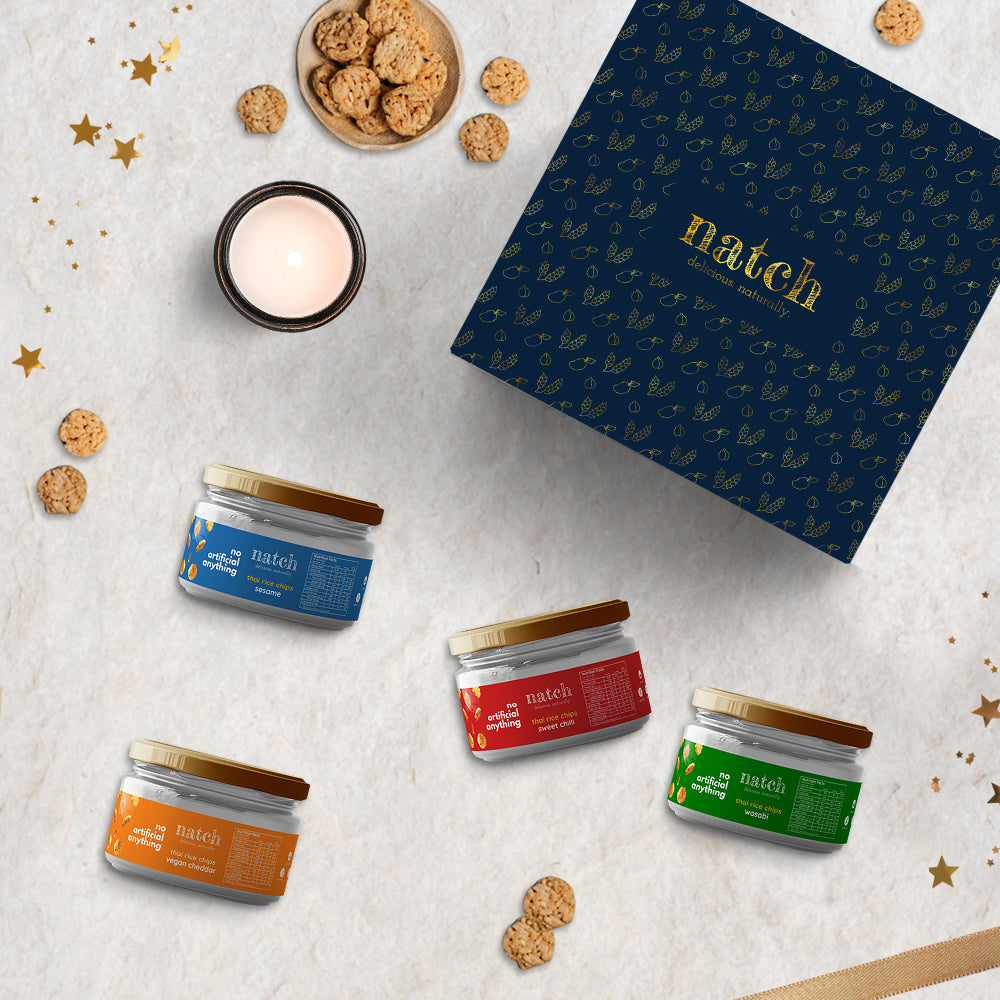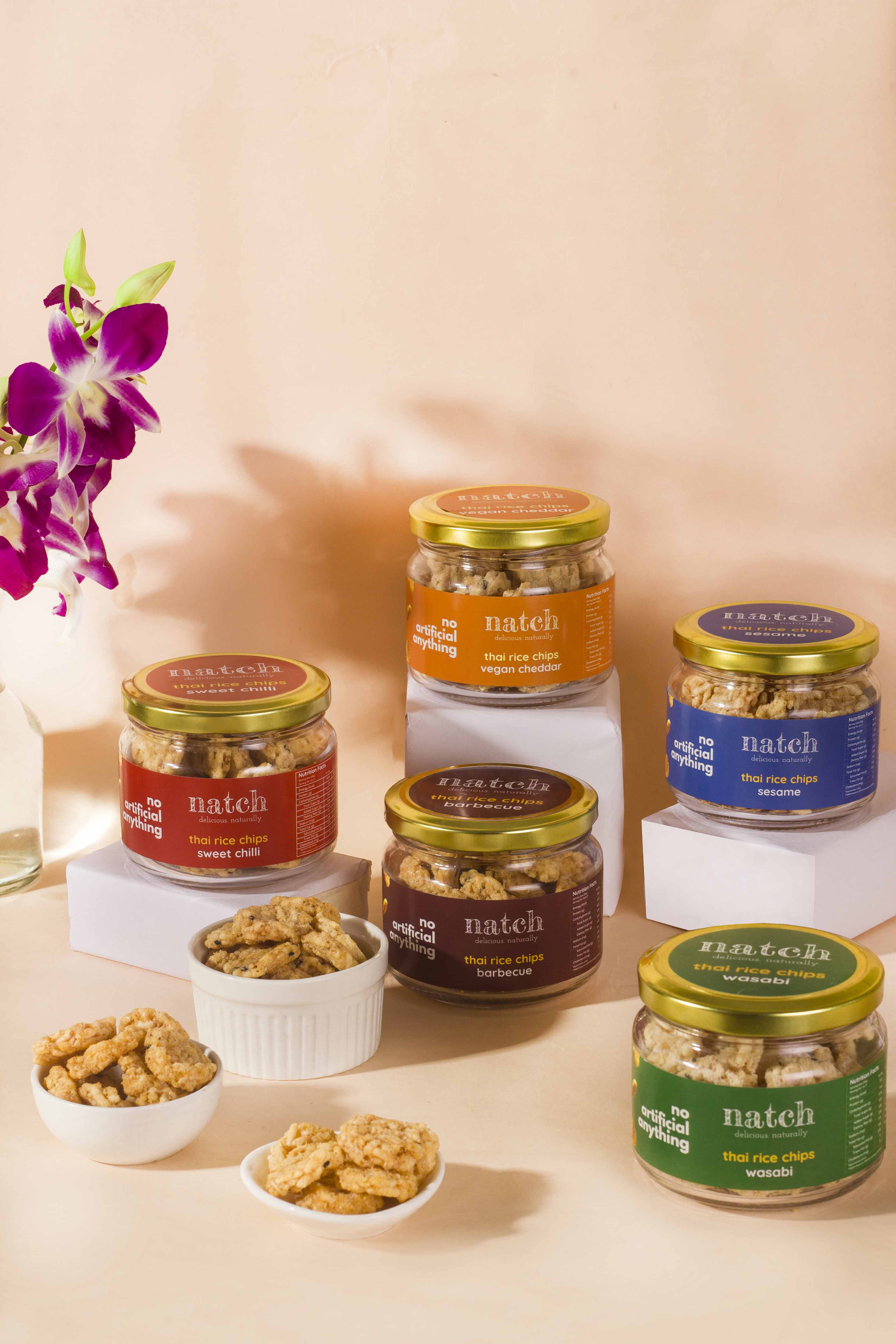 Make gifting unforgettable with our 4-jar thai rice chips gift set! This curated collection brings together the warm nuttiness of sesame, the fiery hit of sweet chilli, the bold zing of wasabi, and the creamy comfort of vegan cheddar. Each glass jar is packed with vibrant flavor, creating a gourmet snacking experience in every bite