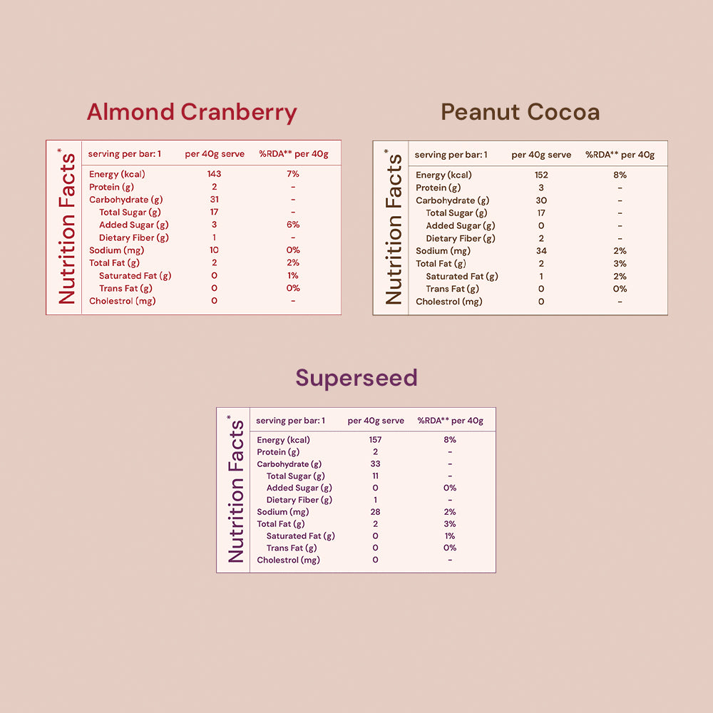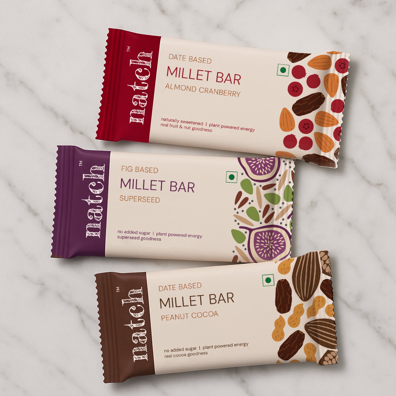 Can’t decide on just one flavour? Our millet bars combo pack brings you the best of all worlds — 2 bars each of almond cranberry, peanut cocoa, and superseed. A wholesome mix of millets, nuts, seeds, and natural sweetness, this pack is perfect for those who love variety and balance in every bite